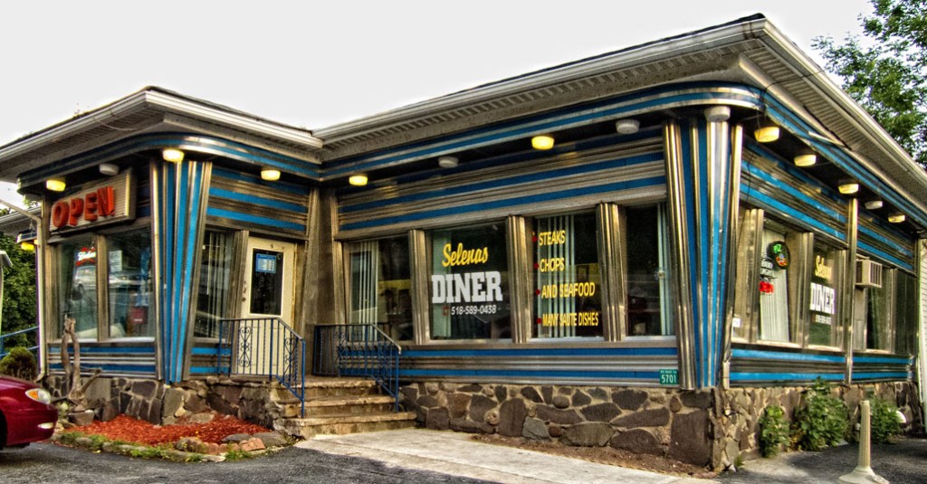 I had my eye on Selena’s Diner in the Catskill village of Haines Falls, New York for a while, and a few weeks ago, after leaving a reception for the Twilight Park Artists Show, where I had pictures on exhibit, I pulled in there quite on impulse to grab a light bite before the long drive through Kaaterskill Clove and down the Thruway. The timing couldn’t have been better; nor could the place where I chose to sit, because I was at one end of the oblong little building and the early evening sun was forming these long streaks of light that led my eye from my seat into and through the length of the diner. I had my discreet little Canon Powershot S95 with me and got several images. As I left, of course, I photographed the outside as well. Here is a selection of the images and how I processed them.