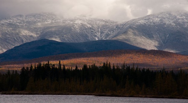 Getting to the Pondicherry trailhead is one thing (I’ve met many native New Hampshirites who’ve never heard of the place); then you have to hike in a good mile or more to where the action is: the shore of Cherry Pond with the spectacular view of Mount Washington and the Presidential Range on the other side. It was quite a windy day, which meant (1) the light and other atmospheric conditions might be changing several times in the course of a minute; (2) there might not be any reflections of the mountains on the pond. It did turn out that the wind occasionally abated enough to create some reflections on the pond, but I discovered that the action of the wind, when it blew, on the water produced its own kind of beauty — a shiny texture. As for the rapidly changing light and other conditions, there was nothing to do but set up the camera, find a good composition that could be tweaked here and there, watch and enjoy nature’s amazing show, and press the shutter button whenever nature’s kaleidoscope produced a new version of the scene in front of me. It was indeed quite spectaular. We’ve heard of son et lumiere — “sound and light” shows, but this was neige et lumiere — snow and light, as the interplay of snow showers and sunlight continuously created different scenes on Mount Washington’s peaks. When I arrived in New Hampshire a few days earlier there was no snow on the mountains. The morning after my visit to the Cherry Pond, Mount Washington could be seen from North Conway completely covered in snow gleaming in the bright sun. Amazing. Sun, snow, and mountains, bless the Lord.