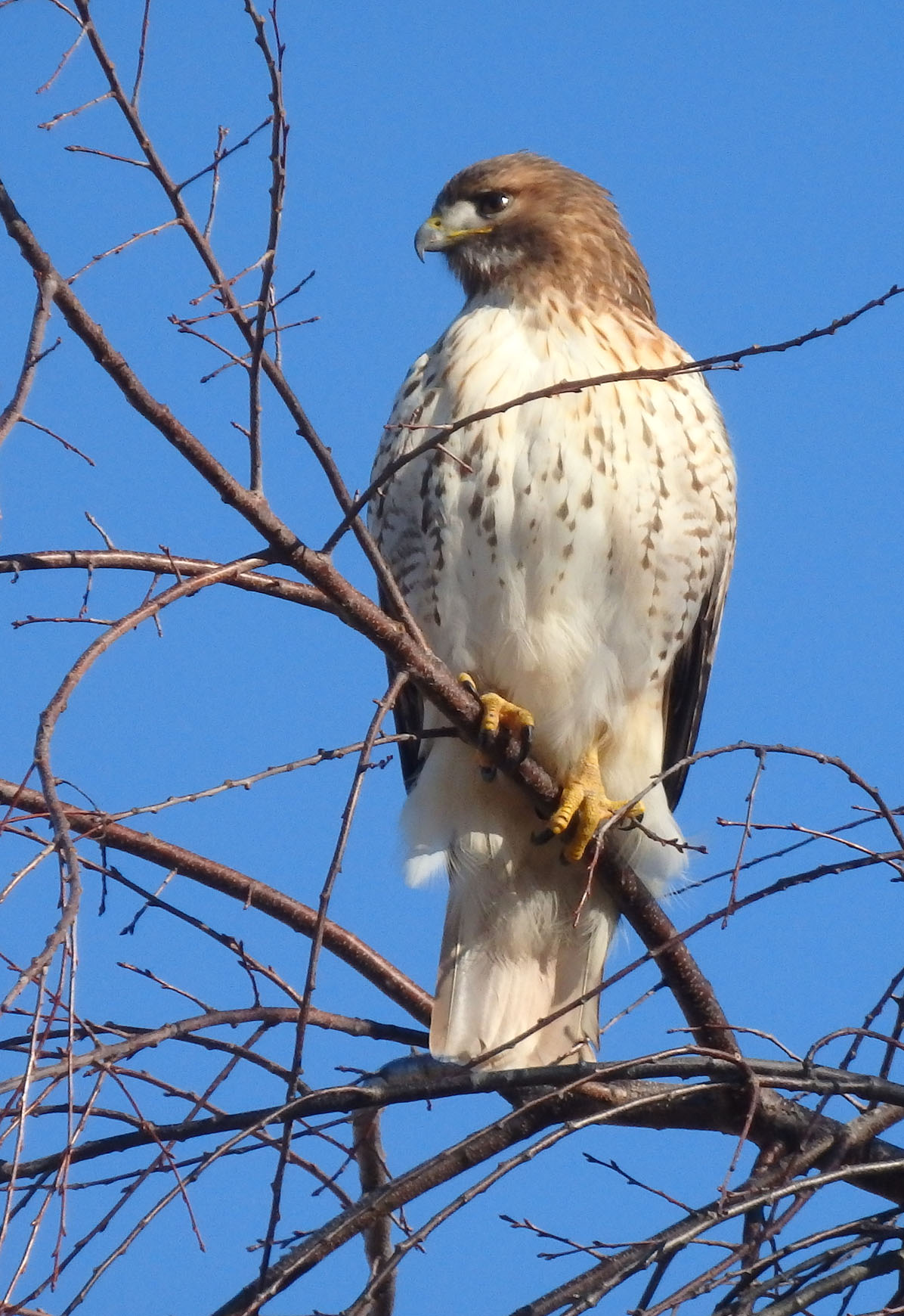Finally, here’s one that I like to think goes beyond just a plain old bird snapshot. This Red-Tailed Hawk was perched in a tree at the McIntosh Audubon Preserve in Bristol, Rhode Island last month, patiently waiting to find someone to eat. Very patiently. And he wasn’t bothered by my walking slowly and ever closer to where he was. He had his back to me and eventually I was