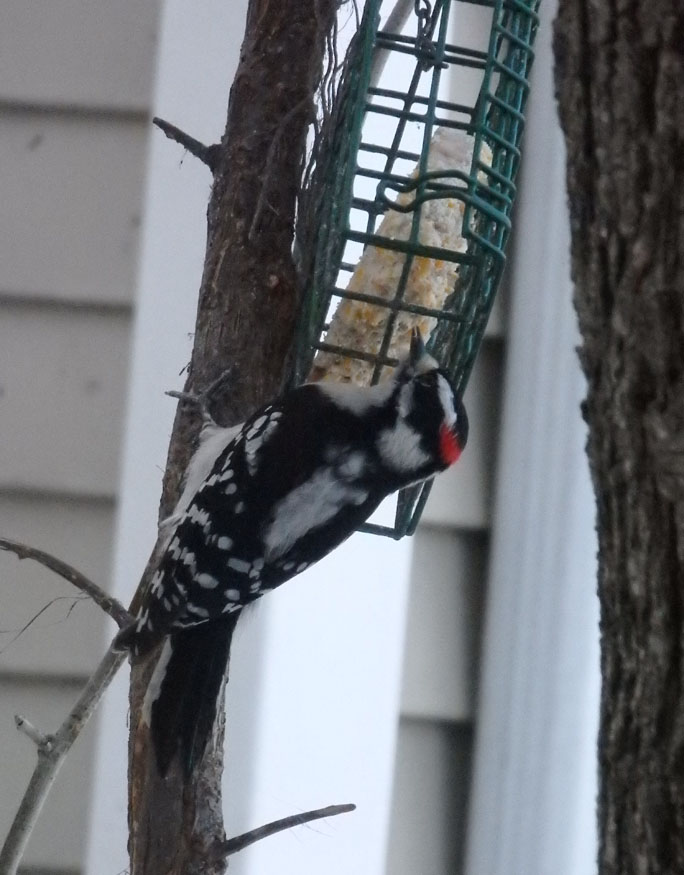 Mr. Downy Woodpecker (the red cap identifies him as male), who seems to have moved in permanently; I sometimes see his mate, as well as a second male who is, in the opinion of the first Mr., avis non grata; or —
